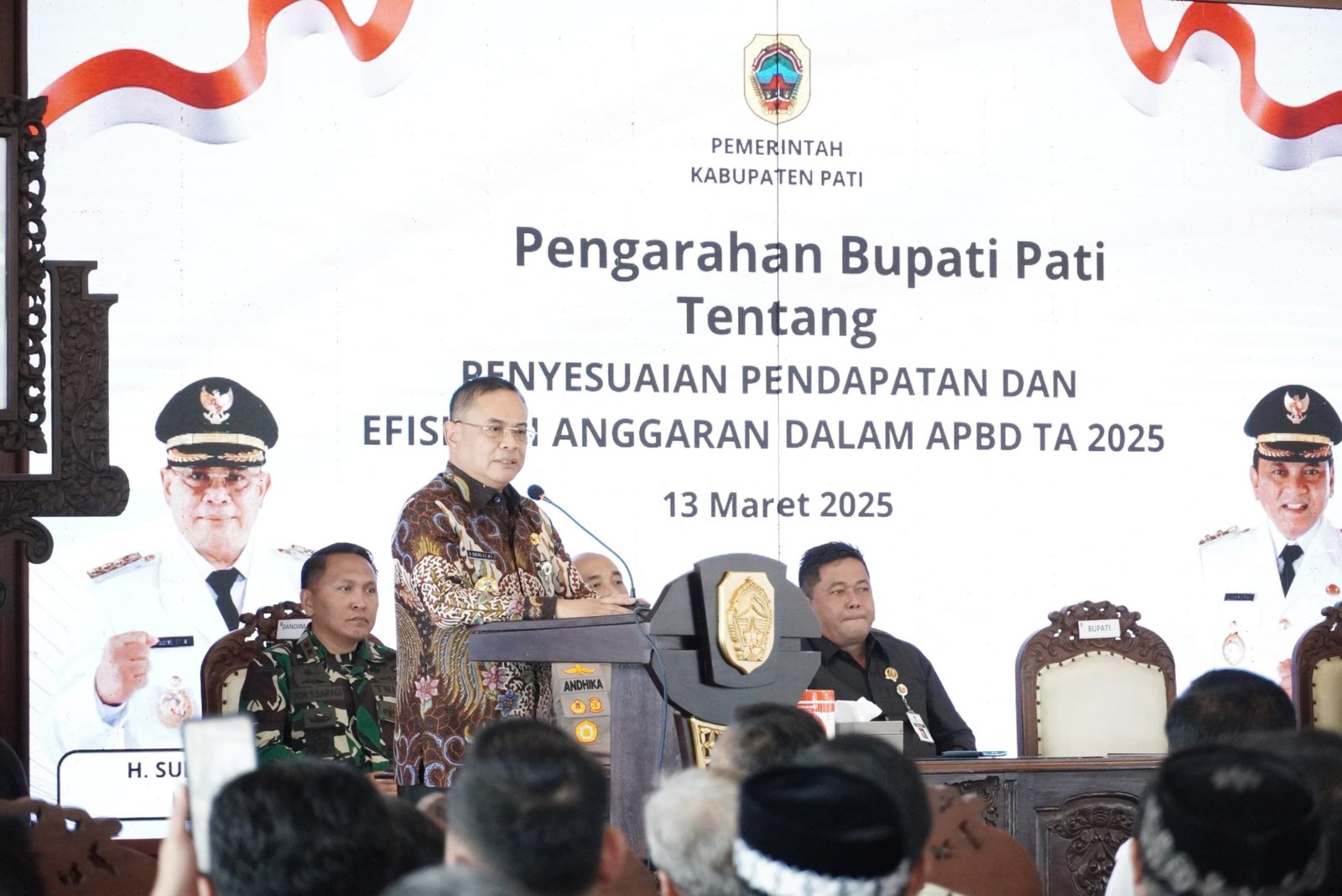 Pati, 13 Maret 2025 – Bertempat di Pendopo Kabupaten Pati, Bupati Pati, Sudewo, memberikan pengarahan tentang penyesuaian pendapatan dan efisiensi belanja daerah dalam Anggaran Pendapatan dan Belanja Daerah (APBD) Tahun Anggaran (TA) 2025. Kegiatan ini dihadiri oleh Ketua DPRD, Wakil Ketua DPRD beserta anggota, Wakil Bupati, Forkopimda, Sekretaris Daerah (Sekda), para Asisten, Kepala Organisasi Perangkat Daerah (OPD), Camat, Kepala Bagian di lingkungan Setda, Lurah, dan Kepala Desa se-Kabupaten Pati, serta sejumlah tamu undangan.